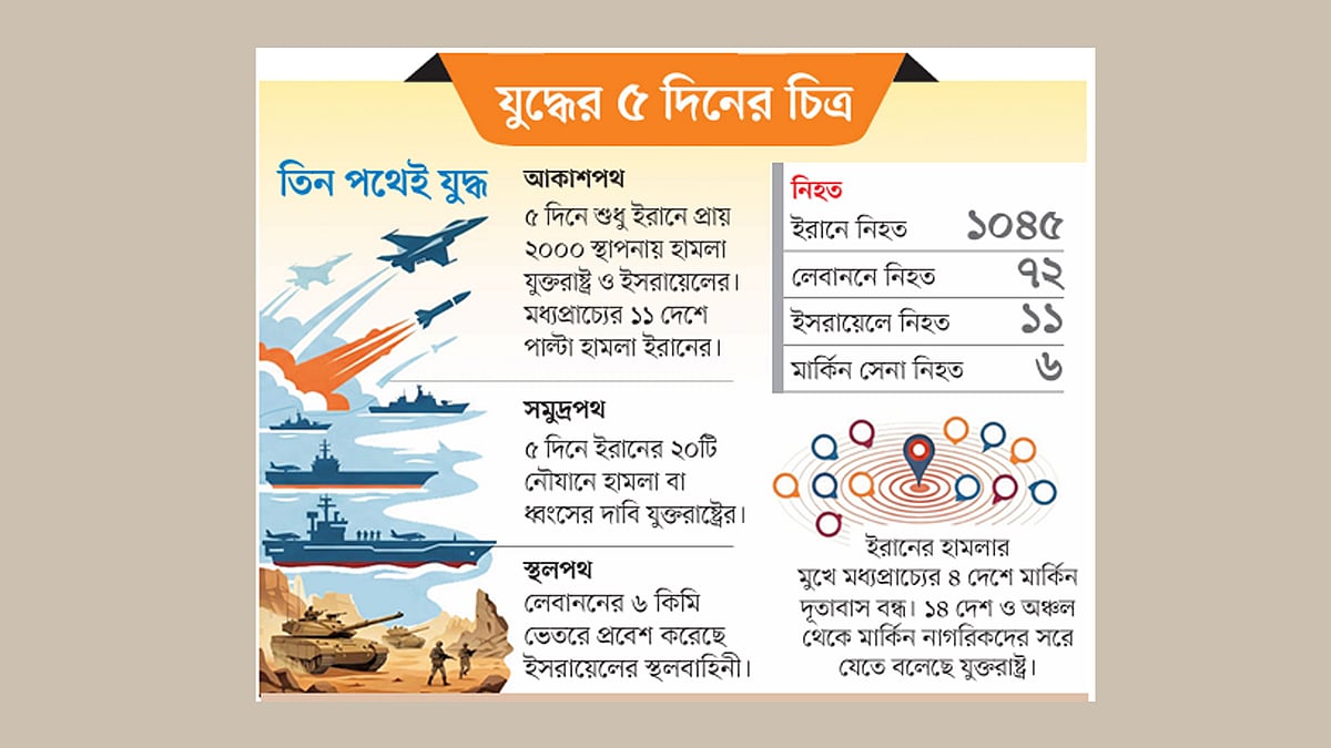 মধ্যপ্রাচ্যে চলমান যুদ্ধের তীব্রতা আরও বেড়েছে। গতকাল বুধবার যুদ্ধের পঞ্চম দিনে ইরান ও লেবাননে হামলা জোরদার করেছে যুক্তরাষ্ট্র ও ইসরায়েল। ইরানে নিহতের সংখ্যা হাজার ছাড়িয়েছে। পাল্টায় আশপাশের যুক্তরাষ্ট্রের মিত্রদেশগুলোতে ক্ষেপণাস্ত্র ও ড্রোন হামলা চালিয়েছে ইরান। এর মধ্যে মধ্যপ্রাচ্যে যুক্তরাষ্ট্রের সবচেয়ে বড় সামরিক স্থাপনা কাতারের আল-উদেইদ ঘাঁটিতে আঘাত হেনেছে ইরানের ব্যালিস্টিক ক্ষেপণাস্ত্র। আর দুবাইয়ে মার্কিন কনস্যুলেটে বিস্ফোরিত হয়েছে ইরানের ড্রোন।